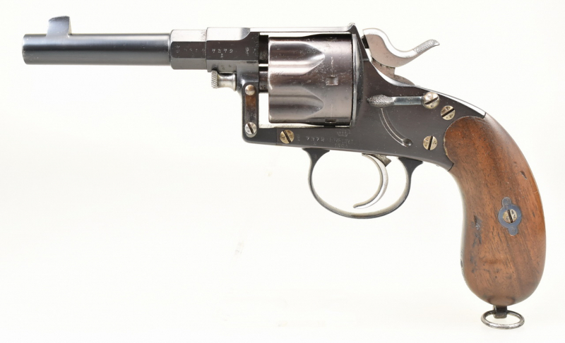 Nummerngleicher deutscher Armeerevolver Modell 1883; auch bekannt als Reichsrevolver M/83. Verkleinerte und leicht verbesserte Ausführung des Revolvermodells M/79 für Fußtruppen und Offiziere. Hergestellt im königlichen Arsenal zu Erfurt im Jahre 1894. Die 1909 außer Dienst gestellten Revolvermodelle M/79 und M/83 wurden während des ersten Weltkrieges reaktiviert. Rauer Originallauf. Ohne Neubeschuß oder Fremdstempel ! Griffrücken mit gelöschtem Truppenstempel " 36.A.E.1.89. " einer Ersatz - Abteilung sowie " 1.MII.1.R.37 ". Originale Holzgriffschalen. Der Revolver wurde vor längerer Zeit überarbeitet und neu brüniert. Metallteile stellenweise mit erkennbarer Närbchenbildung. Details siehe Bilder.