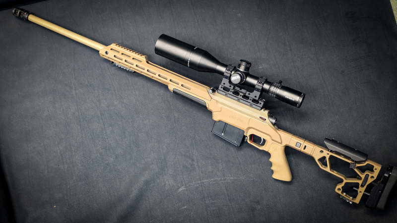 Die Waffe sitzt in einem MDT ESS Chassis, klappbar, sandfarben, mit höhenverstellbarer Schaftbacke. Der Bix’n Andy Sport Tac Abzug (ohne Vorzug) sorgt für ein exzellentes Abzugsverhalten. Das System ist Remington-700-kompatibel und nutzt AICS-Einsteckmagazine.