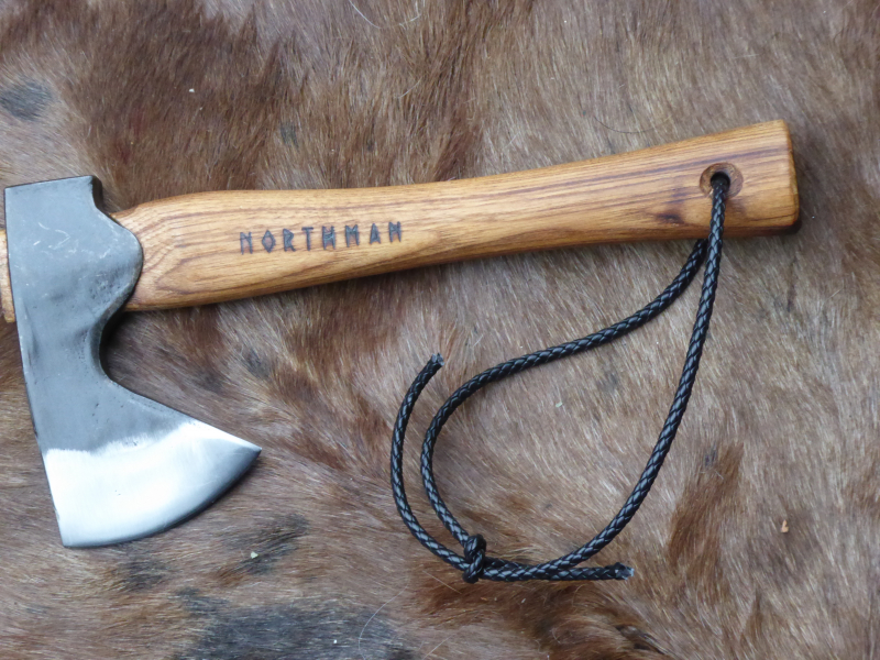 Sie bieten auf ein finnisches Jagdbeil Modell der Marke "NORTHMAN" im Kuraseando Stil mit breiten Backen, Eichenfarbenem Stil und geflochtenem Fangriemen.