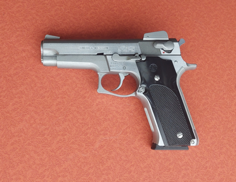 Eine Pistole von Hersteller "Smith & Wesson" - Mod. 659 / Kal.: 9mm Luger / Stainless-Steel-Ausführung / leichte, oberflächige Gebrauchsspuren / der Lauf ist innen blank, die Züge sind scharf / Visierung ist verstellbar / Lauflänge ist 102mm (4") /