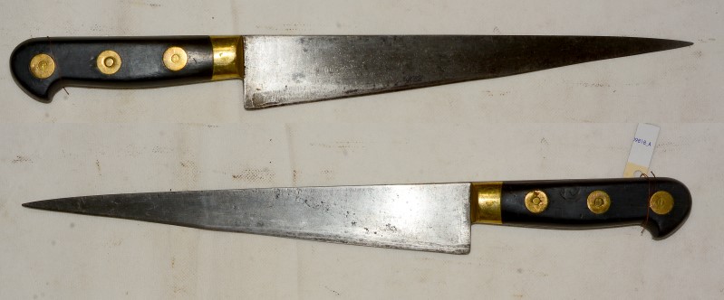 Großes afrikanisches oder vom Balkan stammendes Messer, 29cm lange keilförmige Klinge, insgesamt 43,6 cm lang, schwerer Griff mit Holzgriffschalen und Tellernieten aus Messing, guter Zustand mit Alters und Gebrauchsspuren.