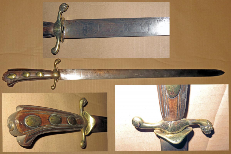 Die zweischneidige Klinge (47 cm) ist geätzt mit Jahreszahl „1703“, nach vorne noch schwach erkennbare verputzte Ätzung.