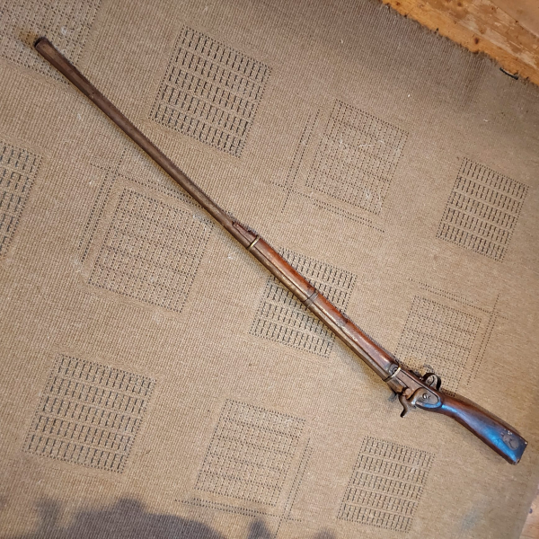Vorderlader im unverbasteltem Fundzustand, siehe Fotos, Schloss und Federn OK, schwerer 8-Kantlauf, Laufmündung leicht trichterförmig, Gesamtlänge 138 cm, mit Patchbox, sende auf Wunsch weitere Fotos, etwas für unerschrockene Restauratoren über die Wintermonate