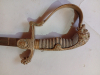 Griff mit Filigran-Rochenhaut überzogen (Abnutzungsspuren). Beschlag aus ziseliertem Messing, Knauf mit Löwenkopf und Glasaugen, Blücher-Parierstange mit ziselierten gekreuzten Säbeln und Eisernem Kreuz, Halböhrchen, darunter eines mit Quallenkopf. Klinge mit Signatur „SCHRODER FRANKEL” in Karlsruhe, zu einem Drittel mit Blattwerk graviert. Länge: 99 cm.