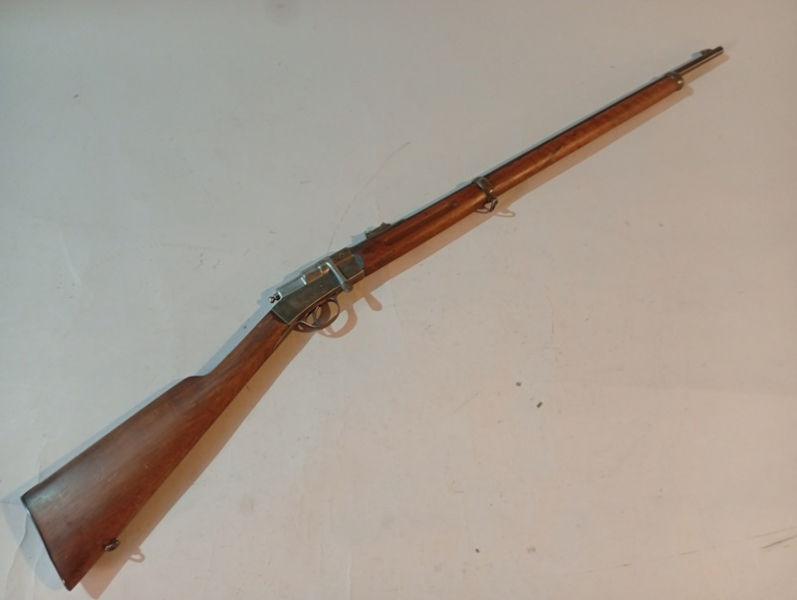 Kaliber 6 mm. Bronzierter runder Lauf mit Visier. Verschluss mit der Aufschrift „MODELE 1895 CARABINE BUFFALO BREVETE SGDG” . Nussbaumschaft . Züge vorhanden. Bronzierte Oberfläche. Länge: 106 cm.