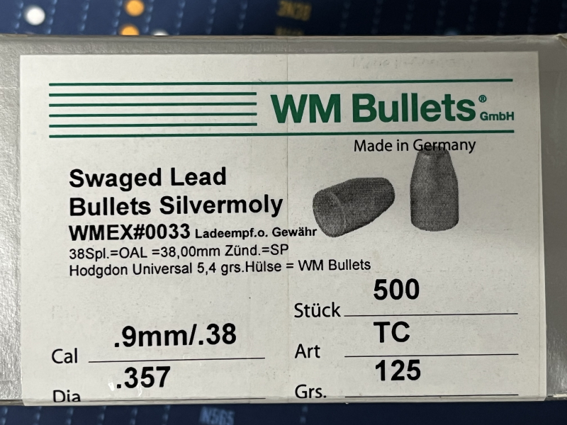 Geboten wird auf eine Packung WM-Bullets Silvermoly WMEX#0033 Kegelstumpf im Kaliber 9mm (.357 Diameter) mit 125 gr. Gewicht. 500 Stück in Originalverpackung.