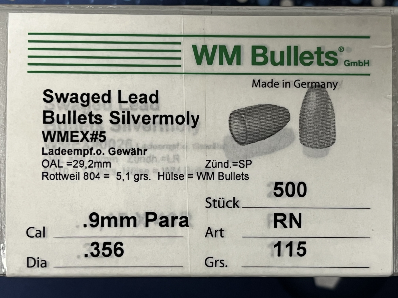 Geboten wird auf eine Packung WM-Bullets Silvermoly WMEX#5 Roundnose im Kaliber 9mm (.356 Diameter) mit 115 gr. Gewicht. 500 Stück in Originalverpackung.