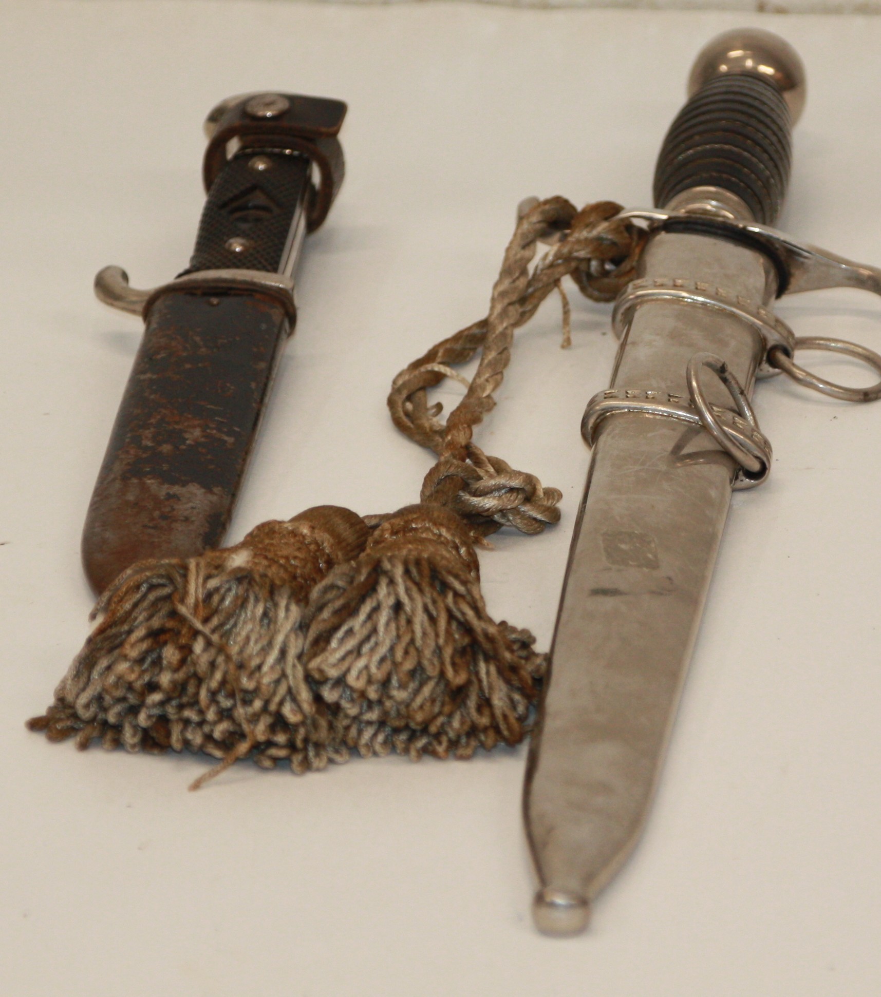 1 x HJ Dolch Entnazifiziert. Hersteller: Hubertus, Solingen. Alters- und Gebrauchsspuren. Total 24,5 cm. Klinge 14 cm.
