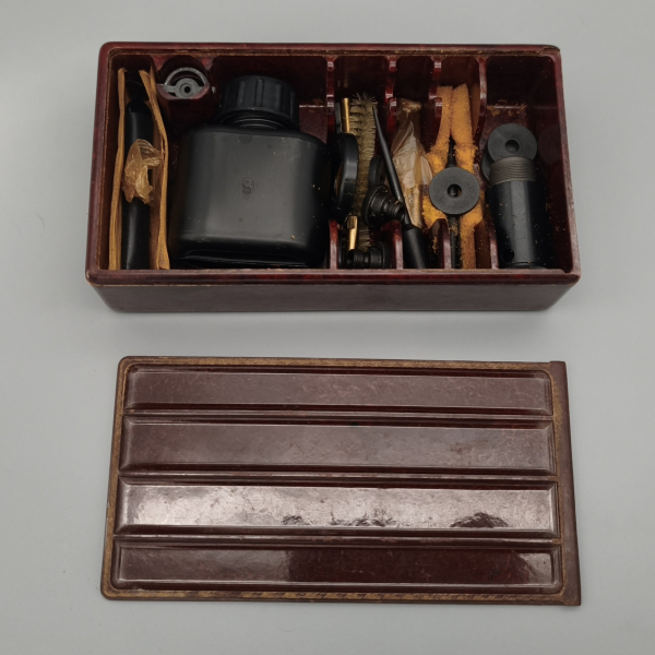 Schöne Bakelitbox mit Schiebedeckel. Enthält verschiedene Ringkorne, Laufreinigungsbürsten, einen Schraubendreher, Diopterscheiben und ein Ölfläschchen. Vermutlich von der izhmash IZ-215.