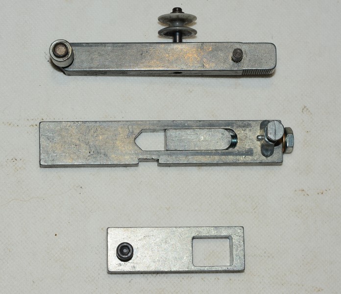 Teile zur Dillon Wiederladestation, verstellbarer Pulverschieber (Querschnitt 21x9,3 mm), Zündhütchensetzer (Querschnitt 14x11 mm) und ein Teil, ev. zum Schrotfüllen., sehr guter Zustand