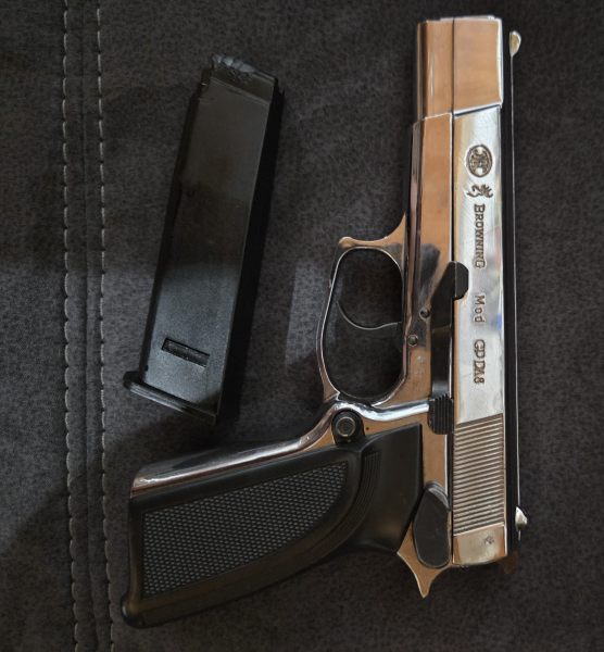 Ausführung: verchromt mit Kunststoffgriffschalen, Schlittenfang