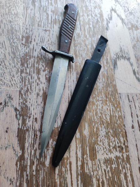 schwarze Scheide mit Lederriemen , der ist leider gerissen .