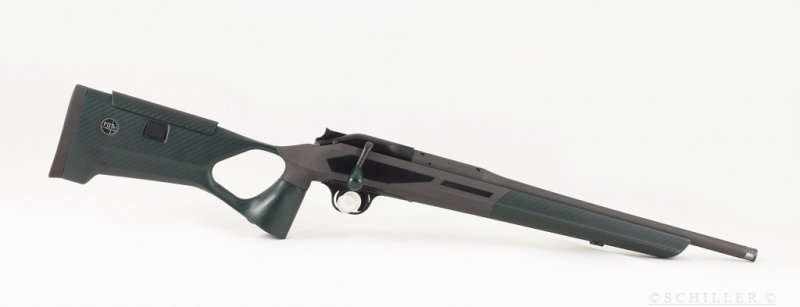 Der Standardschaft wurde durch einen sehr leichten Carbonschaft von der Firma FBT ersetzt. Dieser bietet Schnittstellen für Riemenbügel und Zweibein mit Schnellverschluss und besitzt eine per Knopfdruck höhenverstellbare Wangenauflage.
