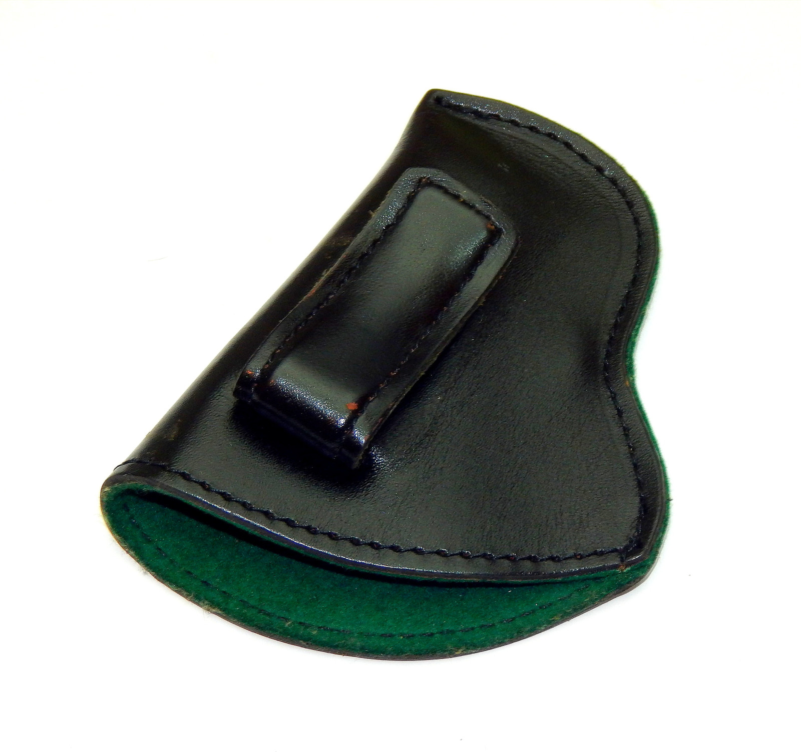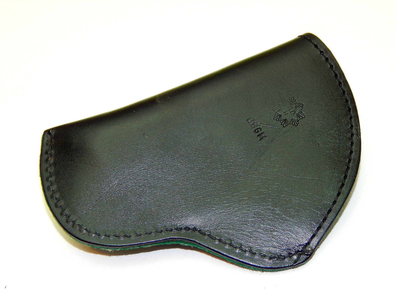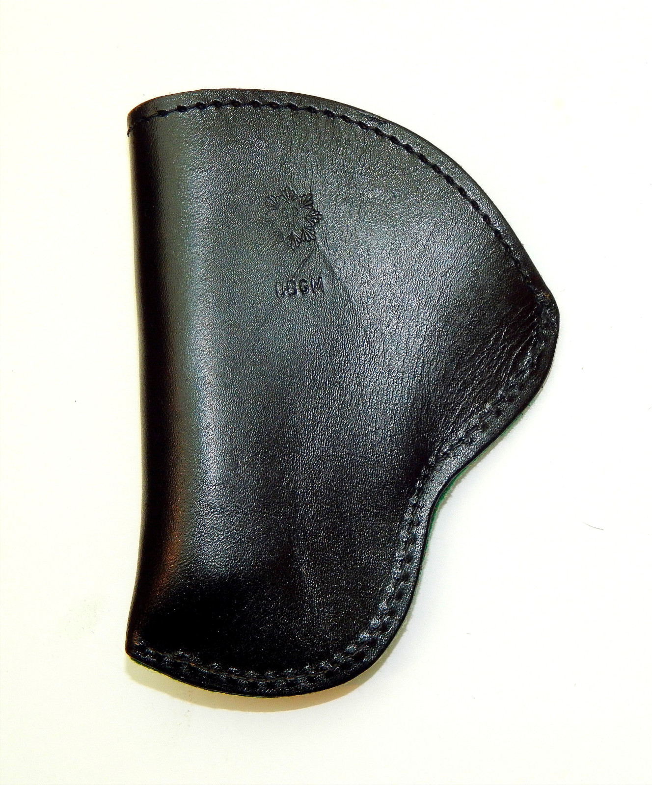 Wie auf den Bilder zu entnehmen aus schwarzem Glattleder, geschlossen am Lauf, Schnellzieher ohne Verschluss und mit der für diese Art Holster üblichen Stahlklemme, in diesem Fall auch schön mit Leder überzogen. Innen waffenschonend "Billard" gefüttert.
