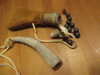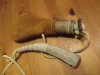 Kugelbeutel aus Leder, handgenäht, Tülle und Stopfen aus Hirschhorn gefertigt, Tülle handgraviert. Länge 20,5 cm, für Rundkugeln bis incl. cal.54, + superschönes olstyle Pulvermaß aus Hirschhorn, verschnitten und verziert , Länge 14 cm, ca. 50 grn. Replikat des 18. Jahrhunderts ECHTE HANDARBEIT !! DAS ULTIMATIVE WEIHNACHTSGESCHENK FÜR DEN REENACTOR !!!!