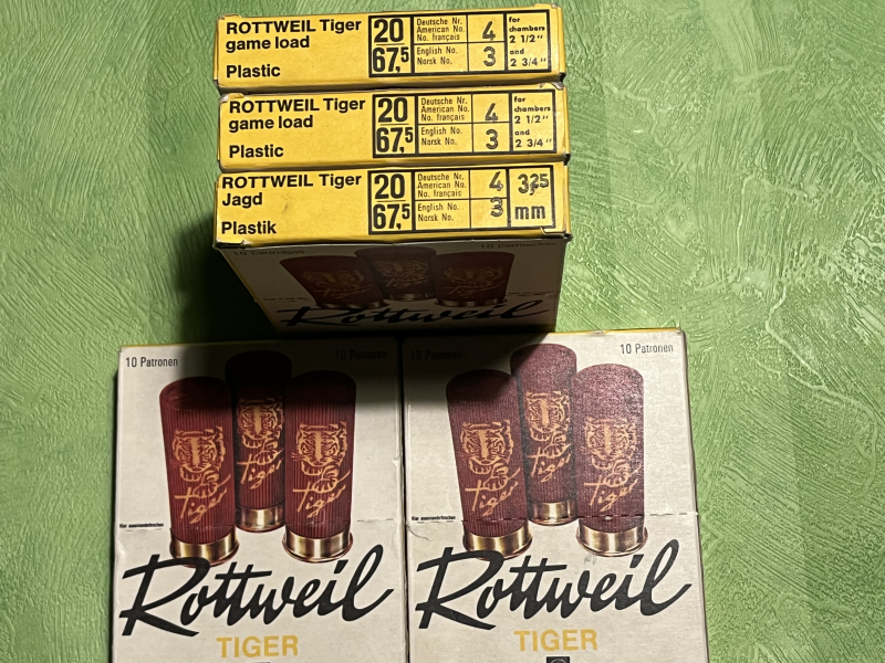 Vorhanden sind 100 ( 4x 25 er Pack. )Patronen 20/70 NIKE SKEET mit 2,0 mm Vorlage —— 25 Stück 5x 5er Pack. FEDERAL BUCKSHOT ( Röller ) in 6,35 mm —— RWS WAID.M.H 30 Stück ( 3x 10er Pack. ) in 3,5 mm u. 1Stück ( 1x10er Pack. ) in 3,0 mm ——— und ein Rest von 2x Waidmannheil Pappe in 3,5 mm und 2x Brenneke Plastik ——