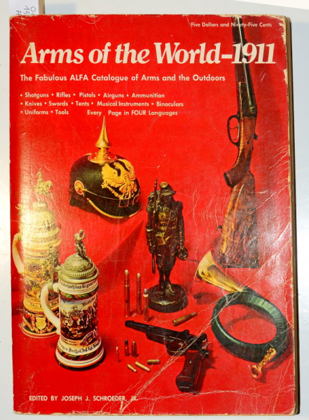 Katalog "Arms of the World 1911", Nachdruck des ehemaligen Stoeger Verkaufskatalogs, ein in den 1970er Jahren unter Sammlern sehr verbreitetes Buch, darin die meisten 1911 erhältlichen Militär- und Jagdgewehre, Pistolen, Revolver und Munition mit den damaligen Preisen, 4-sprachig Deutsch, Französisch, Englisch und Spanisch, der Einband etwas verknickt, ansonsten guter Zustand