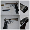 Zum Verkauf steht eine GP DA 9 im Kaliber 9mm Knall/Gas. Mit der PTB 772 *** Beschuss:BK/2019, Köln. *** Bicolour, eine seltene und sehr eindrucksvolle Kombination in Nickel und matt hellgrau.*** Die Schreckschusswaffe ist voll funktionstüchtig. SA/DA und Schlittenfanghebel funktionieren 1A. Eine legendäre Konstruktion des genialen John Moses Browning, der seiner Zeit stets einen Schritt voraus war. Schon mit dem Vorgängermodell bewies Browning seine Innovationskraft. Bis heute vertrauen Militärs und Spezialeinheiten auf der ganzen Welt dieser robusten und wegweisenden Konstruktion. Wie es sich für eine legendäre Browning gehört, ist die GPDA 9 natürlich aufwändig ausgestattet: Sie ist ausgestattet mit einem Spannabzug und neben dem funktionierenden Schlittenfanghebel noch mit einem beidseitig bedienbaren Entspannhebel. Browning GPDA 9 - Die Gas-Signal-Waffe für Profis im Kaliber 9 mm P.A.K., mit schwarzen Kunststoffgriffschalen. Mit dabei ein passendes Ersatzmagazin und 5 Platzpatronen, siehe Fotos . Und natürlich eine Putzbürste. Die Waffe wird im Originalkoffer geliefert, siehe Fotos. Technische Daten:Marke:BrowningModell:GPDA 9System:Schreckschuss-/Reizstoff-/Signal-PistoleKaliber:9 mm P.A.K.Magazinkapazität:9 SchussGewicht:820 g (940 g inkl. Magazin)Lauflänge:124 mmGesamtlänge:195 mmBreite:38 mmHöhe:133 mm *** Abzug:Double Action, Entspannhebel, Ausführung:schwarz , Lieferumfang:Waffe, Reinigungsbürste, 5 Schuss Munition und Bedienungsanleitung***