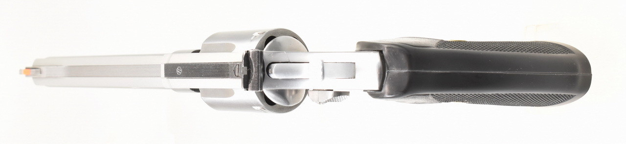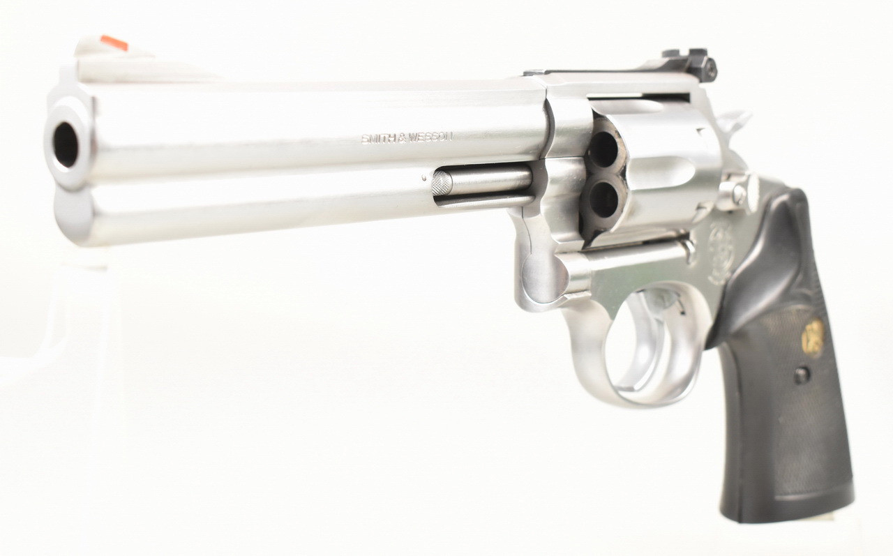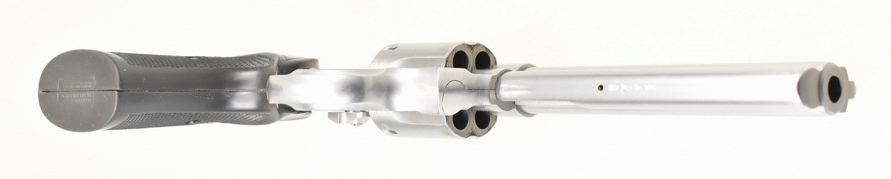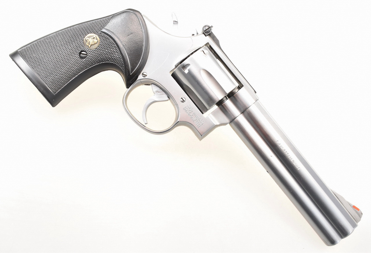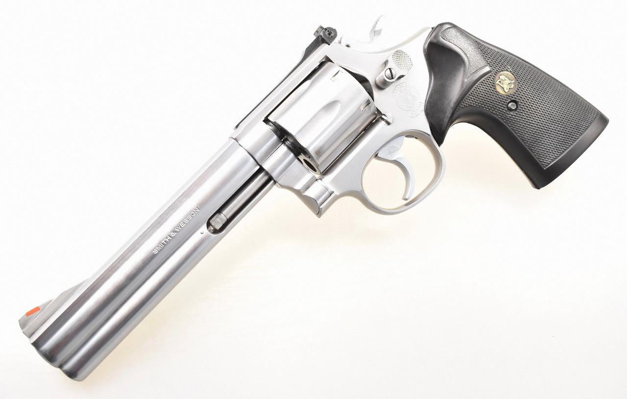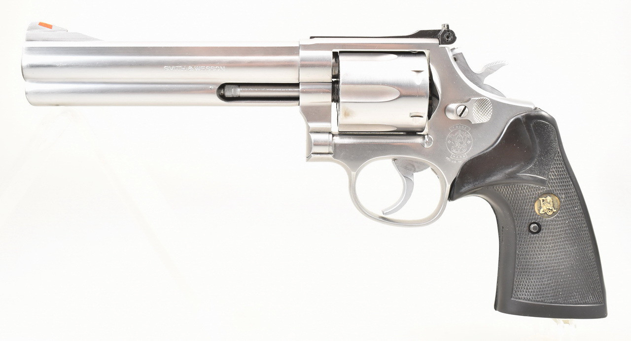 Gebrauchter, sechsschüssiger Double - Action Stainless - Steel Revolver des bekannten amerikanischen Herstellers Smith & Wesson Modell 686 - 1. Spiegelblanker Lauf. Belgischer Beschuß. Wischo Vertriebsstempel. Höhen- und seitenverstellbare Kimme. Rampenkorn mit roter Kunststoffeinlage. 190mm lange Visierlinie. Pachmayr Presentation Gummigriff mit Fischhautmuster. Details siehe Bilder.