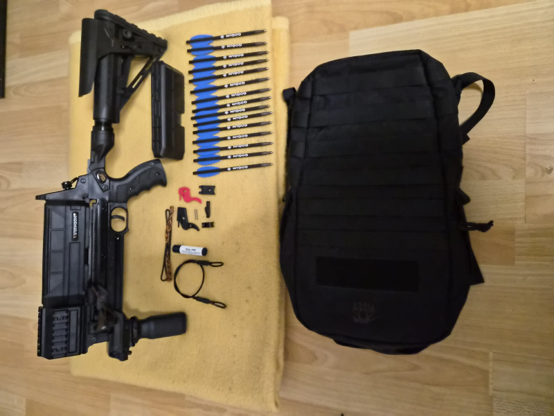 Ich biete eine neue Pistolenarmbrust zum Sportschießen und zur Home Defence an. Der Komplettsatz besteht aus : M10 Stinger II - Pump Aktion System, -15- hochwertige schwere Präzisionspfeile von Gogun, Steambow Wurfarm mit 55 lbs, Tuningtrigger eingebaut (mit 2 Ersatztriggern), -2- Magazine mit Leerschußsicherungen im Magazin eingebaut, offenes System zum Schnellwechsel des Wurfarmes, 1 Lochkimme + 1 V-Kimme von Reini Rossmann, Schnellwechsel Adapter zur Demontage des kompletten Schaftes (1 Klick), im Original Armbrustrucksack von Tasmanian Tiger, Ersatzsehne + Spannseil, Sehnenwachs sowie zwei Ersatzteile ( Adapterstück für Upper + Lösehebel für Adapter.