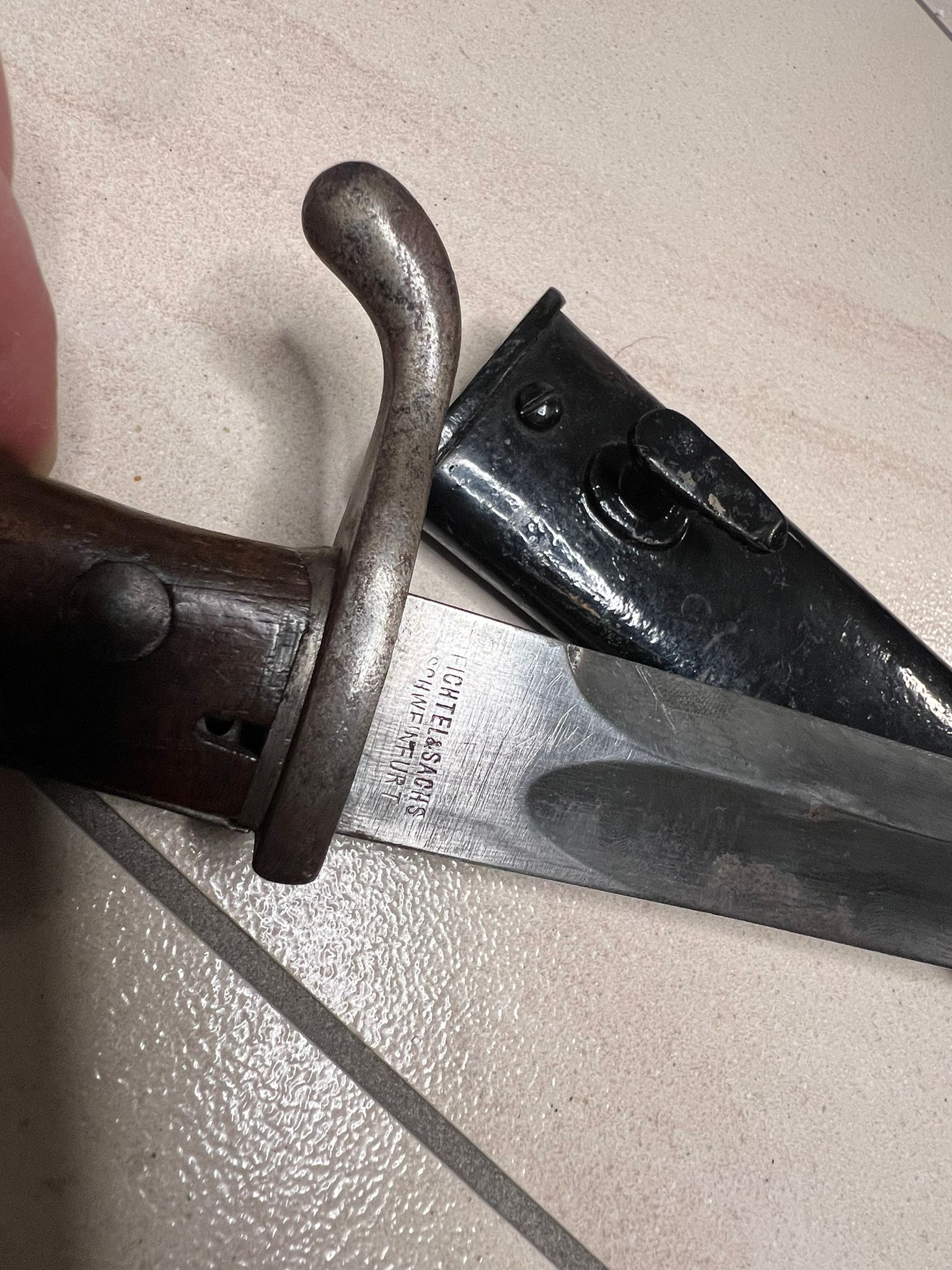 Hierbei handelt es sich um folgende Blankwaffe: Art: Bajonett Herkunft: Deutschlang Hersteller: Fichtel und Sachs Schweinfurt Stempel: Rücken gestempelt L Krone 16 (König Ludwig) Gesamtlänge: ca. 52cm Klingenlänge: ca. 36,8cm Zustand: Bitte anhand der Bilder entnehmen