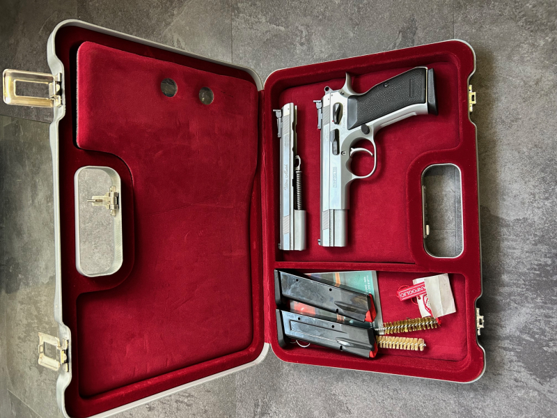 Pistole von Tanfoglio, 45 Auto mit Wechselsystem 9mm Para,, im Originalkoffer mit allen Papieren, LL ist 5 Zoll, ca. 12 cm, war nur bei einem Jäger im Schrank gelegen, ganz wenig geschossen, Verstellbare Visierung, 2 Magazine für 45 ACP dabei und 1 Stück 9mm Para.
