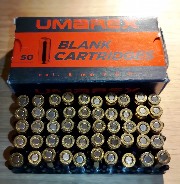 zum Verkauf kommt hier eine Packung 8mm Platzpatronen (cal. 8 mm K.) mit 50 Kartuschen von "UMAREX" - siehe Foto.