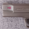 Der Schlitten hat auf einer Seite einen Riss,siehe roter Pfeil.Der Hahn ist abgebrochen, lässt sich nicht mehr abschlagen.