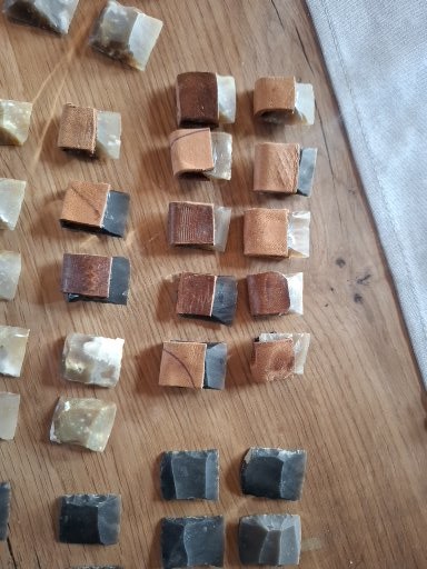 Versteigert werden hier über 70 vorsortierte Feuersteine für das Schießen z. B. mit der französischen Muskete M 1777. Teilweise habe ich sie mit Leder vorbereitet.