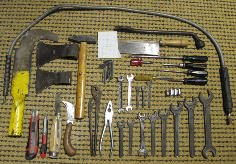 2x Cutter, 4x Schraubendreher flach, 1x Schraubendreher Kreuzschlitz, 1x Hammer, 1x Klappmesser, Diverse Innensechskantsteckschlüssel, je 1x Gabelschlüssel 6,7,9,11,12,14x17,17, 19, 22, 24, 24x27, Gabelschlüssel Zoll je 1x 7/16 x 1/2, 3/8 x 7/16 1x Wasserpumpen Zange, 1x Kombizange, 1x Säge, 1x Stechbeitel defekt, 1x Hippeklinge, 2x Beilklingen, 1x Biegsame-Welle.