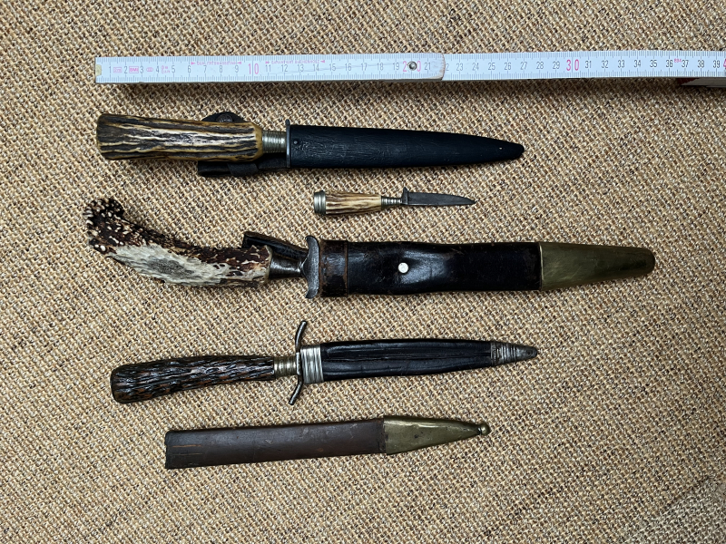 Aus Sammlungsauflösung wird das abgebildete Konvolut aus Jagdnickern / Hirschfängern mit passenden aber nicht unbedingt zugehörigen Scheiden angeboten. Die Klingen sind ohne erkennbare Herstellermarken und teilweise dolchartig geschliffen. Die Griffe und Parierstangen sitzen noch recht fest auf den Klingen. Der Verkauf dieses gebrauchten Konvoluts erfolgt von Privat unter Ausschluss jeglicher Gewährleistung, Garantie, Sachmängelhaftung und Rückgabemöglichkeit. SHIPPING ONLY TO DESTINATIONS INSIDE EU!