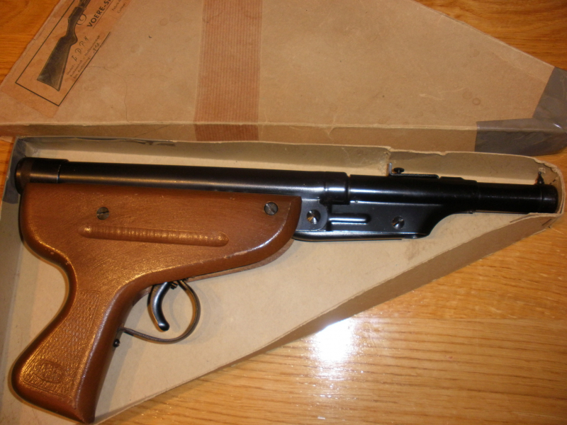 Ungewöhnlich bei dieser Pistole ist das überhöhte Griffstück, so dass sie bei einigen Sammlern schon als „Unikum“ bezeichnet wird. Die Gestaltung des Laufes und der Laufarretierung lassen Ähnlichkeiten mit den Knaben-Luftgewehren DIANA 15 und DIANA 16 erkennen. Da die Läufe dieser Pistolen mit ca. 13 cm aber recht kurz sind, ist der Spannvorgang (auch durch das Perlkorn ) nicht angenehm. Die Kimme ist höhenverstellbar. Positiv einzuschätzen ist aber die Schussleistung. Der Lauf dieser Pistole ist gezogen. Innerhalb der Verpackung wurde wohl das Kaufdatum eingeschrieben (3.3.64).