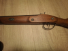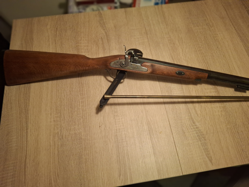 Vorderladerflinte, Kaliber 12, Modell: Trapper. Das Gewehr wurde von mir nie geschossen. War lediglich als Dekoration auf vielen Westerntreffen dabei. Dadurch ist die Brühnierung leicht abgegriffen am Lauf. Der Schafft hat ganz leichte Kratzer, die nicht groß auffallen oder stören. Eine Schloßschraube wurde mal getauscht. Die Funktion ist voll gegeben.