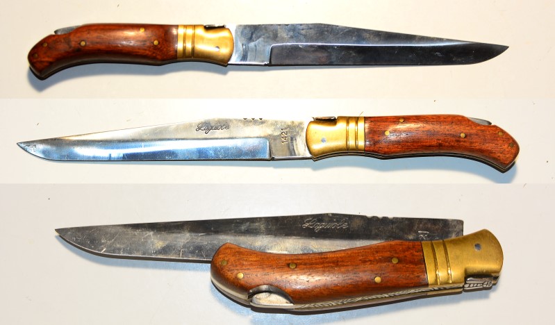 Verwandlungsmesser, kann als kurzes Jagdmesser oder langes hirschfängerartiges Messer genutzt werden, eingeklappt Klingenlänge 6,6cm, ausgeklappt 16,4 cm, Gesamtlänge ausgeklappt 28,2 cm, Hersteller "Laguiole", ohne Scheide