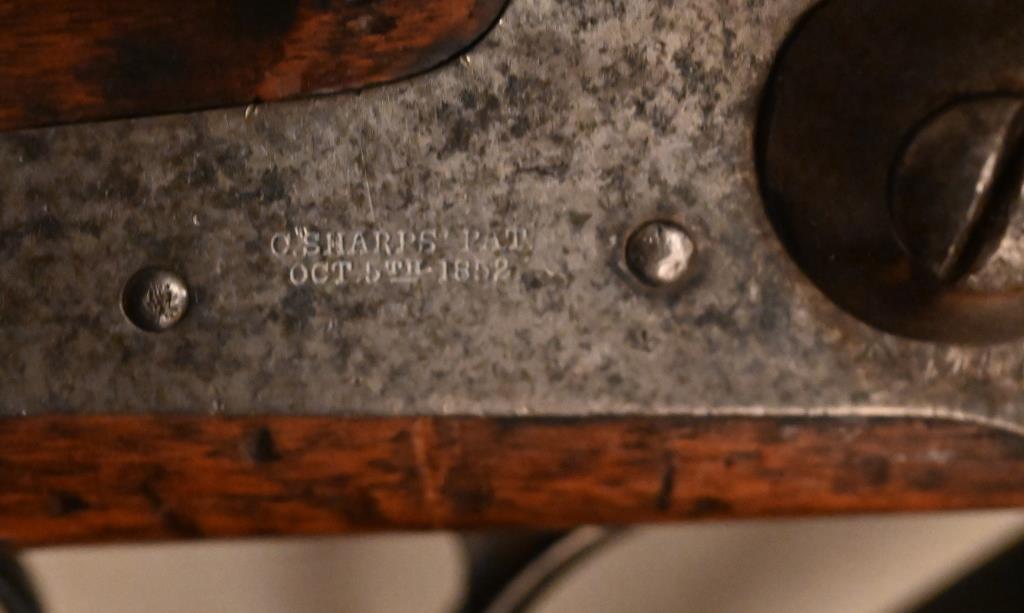 Von der Modellbezeichnung „New Model 1859“ auf der Laufoberseite sind nur noch die ersten 3 Buchstaben "New" schwach erahnbar, aber rechts auf der Schlossplatte sehr gut lesbar Herstellerangabe und Patenthinweis „C. SHARPS PAT. OCT. 5th 1852“, weiter oben, teils vom Hahn verdeckt „R.B. LAWRENCE PAT. APRIL 12th 1859“. Seriennummer „86800“ oben auf dem Kolbenhals. Auf der linken Seite des Gehäuses noch schwach lesbar "PAT. 1849" sowie rechts vom Tragering gut lesbar Initialen "C.W.H." (= Kürzel des Abnahmeinspektors Charles W. Hartwell) bei Sharp. Winziger Abnahmestempel "H" links auf dem Oberring.
