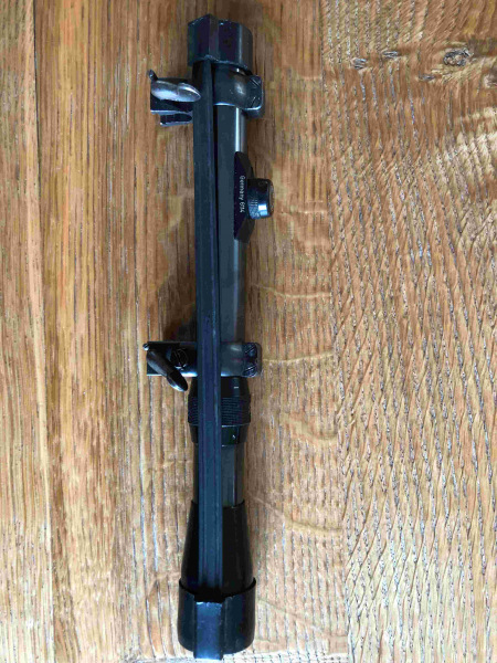 Gebrauchtes, schlankes Zielfernrohr (Länge 25,3 cm, Durchmesser Mittelrohr 2,2cm) aus brüniertem Stahl und mit „Eduard Kettner Köln“ bezeichnet.