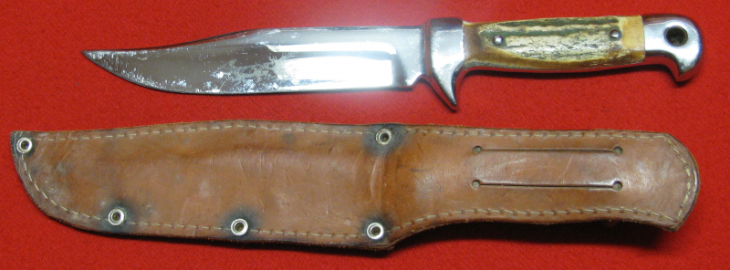 Zum Verkauf kommt ein älteres Bowie / Jagdmesser mit Horn und Lederscheide