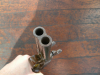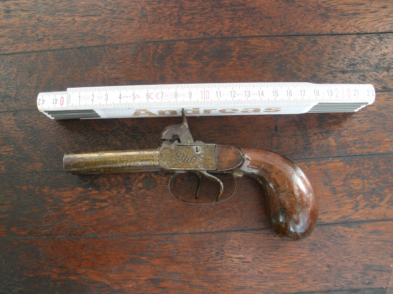 Originale kleine Vorderladerpistole, Doppel-Lauf, wurde vermutlich aufgrund der Größe versteckt getragen,, auf Grund des Alters, muss der Hahn instand gesetzts werden, rastet nicht immer ein., sonst siehe Bildr, sehr dekorativ