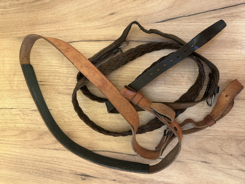 Konvolut bestehend aus 2 gebrauchten Gewehrriemen. Davon 1x Leder geflochten, 1x mit gummierter Unterseite. – siehe Foto