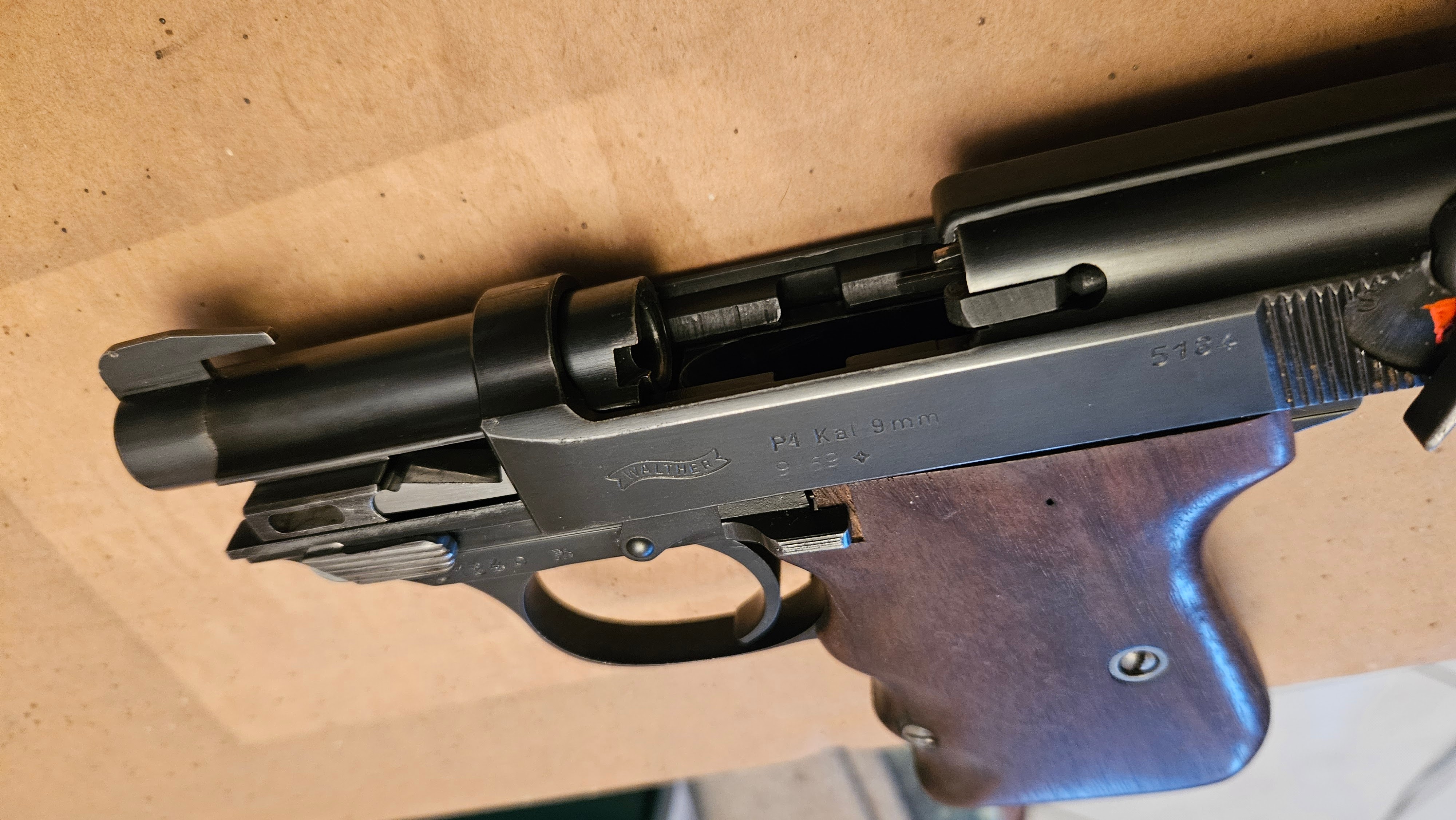 Hier bieten Sie auf eine vermutlich modifizierte Version bzw. ein Einzelstück einer Pistole Walther P4 im Kaliber 9 x 19 mm mit ca. 3“ langem Lauf.