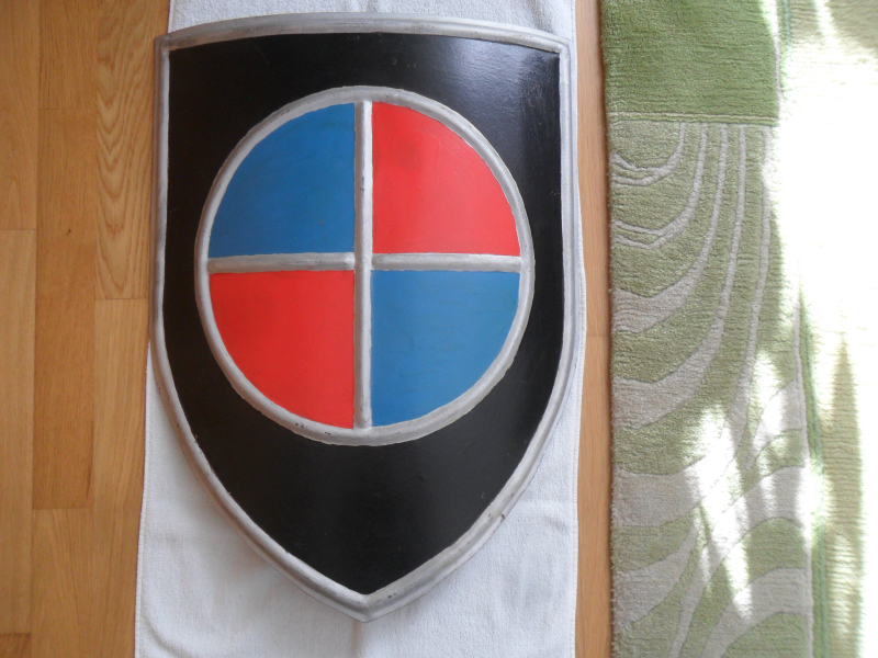 Biete einen mittelalterlichen Schild aus Stahlblech an. Der Schild besteht aus ca.2mm starkem geprägtem Stahlblech, ist 58 cm hoch und seine Breite ist 46 cm mit Fantasiebemalung. Hinten sind Halteösen mit Riemen zum handhaben angebracht.