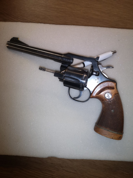 Biete hier einen Matchrevolver Colt Officers Match Cal. 22Lr aus Vereinsbestand an da wir unsere Bestände reduzieren. Der Revolver wurde nur sehr selten geschossen, und es besteht auch kein Interesse bei uns im Verein das Teil zu schießen, daher kann er weg. Voll Funktionsfähig Visierung einstellbar.