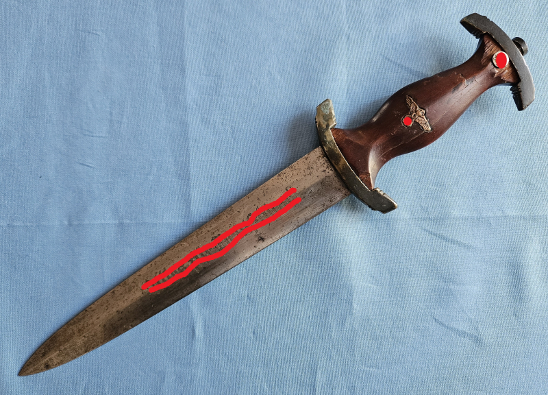 SA-Dolch H&F Lauterjung, Solingen ohne Scheide. Gebietsgruppenstempel Om für Ostmark. Die Parierstangen sind zum großen Teil schwarz, denke mal das es Farbe ist. Adler wurde so stark geputzt das er Kupferfarben ist. Griff mehrfach mit Ausbrüchen und Rissen. Pastille ist im einwandfreien Zustand und scheint mir Original drin zu sein.