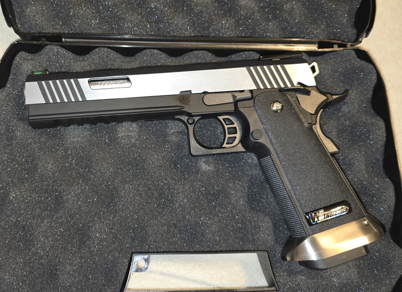 Hallo, biete hier eine WE HI-CAPA 6 Wet Force Typ B in schwarz/silber, Gas, 6mmBB an. Die waffe ist nagelneu und ungeschossen. Sie ist aus metall mit Polymergriff, hat blowback, F Zeichen vorhanden. Waffe hat keine gebrauchspuren, ist im Top Zustand. Mit dabei ein Waffenkoffer