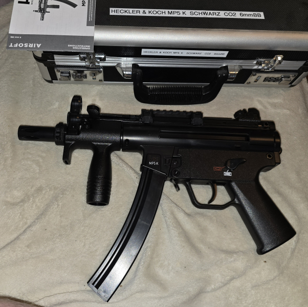Hallo, biete hier eine Heckler und Koch MP5 k in schwarz, CO2, 6mmBB an. Die waffe ist nagelneu und ungeschossen. Sie ist aus Kunststoff, hat kein blowback, F Zeichen vorhanden. Waffe hat keine gebrauchspuren, ist im Top Zustand. Mit dabei ein Waffenkoffer und anleitung