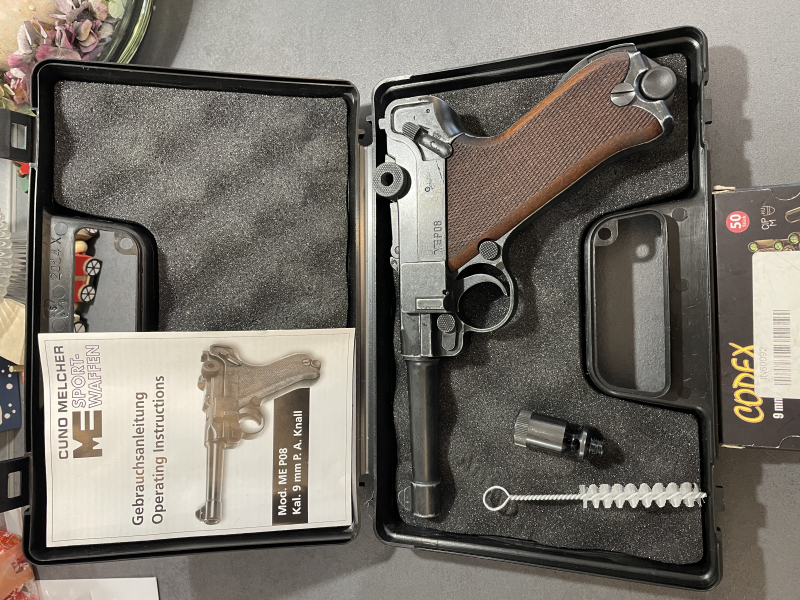 Es ist eine Luga ME P08 von Cuno Melcher im Retrodesign ( Antik Look ) Kaliber 9 mm P.A.K. Mit Beschreibung, Koffer und Zubehör.