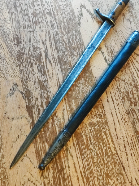 Seltenes Aushilfs Seitengewehr, ursprünglich für Griechenland produziert , dann aber an bayrische Einheiten im ersten Weltkrieg ausgegeben.