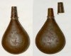 Kleine Pulverflasche aus Eisenblech, Höhe inkl. der Kappe 13,3 cm, größte Breite 7,9 cm. Altersbedingt fleckig aber unbeschädigt und komplett, Ende des 19. Jahrhunderts