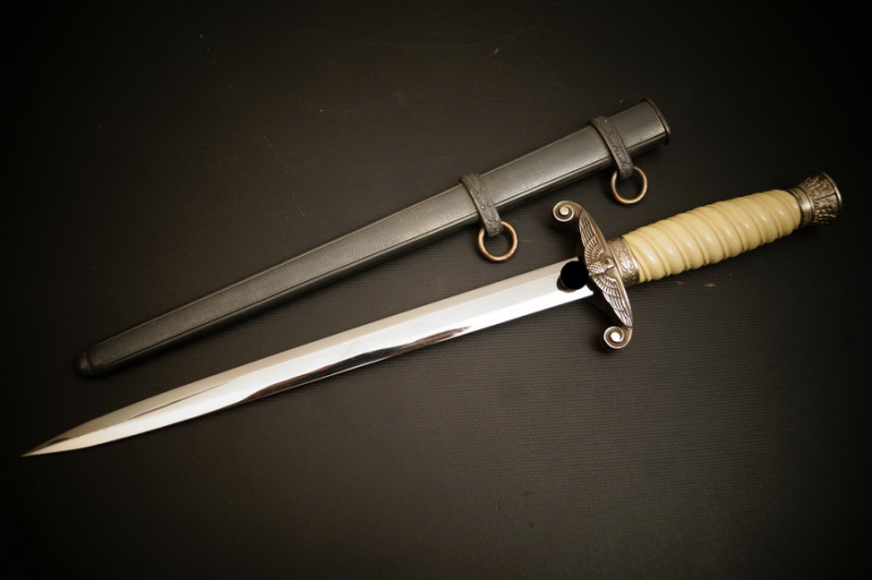 Fundzustand. Scheide aus Stahl, stark versilbert und überwiegend grau angelaufen - ungeputzt ! Blanke Klinge mit feiner Herstellerätzung von Eickhorn. Parierstange aus Buntm. Oder Neusilber - extrem fein !!! Griffstück aus Holz - Cellon ist unbeschädigt ! Weißes Cellon und langer Griff. Traumhafter Offz. Dolch !