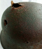 Stahlhelm, Mod. M42.WK2 mit original Innenring .Stahlhelm mit Einschussloch und mehrere weitere große Splitterlöcher .